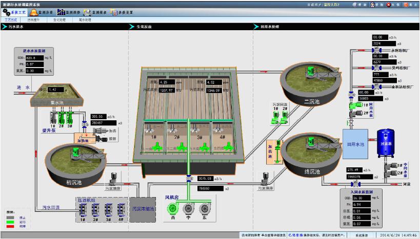 ■ 總畫面:表現(xiàn)的是整個(gè)污水處理流程,在相關(guān)位置顯示水處理的各主要控制參數(shù)以及重要設(shè)備的主要控制參數(shù),可以點(diǎn)擊進(jìn)入各工藝畫面。